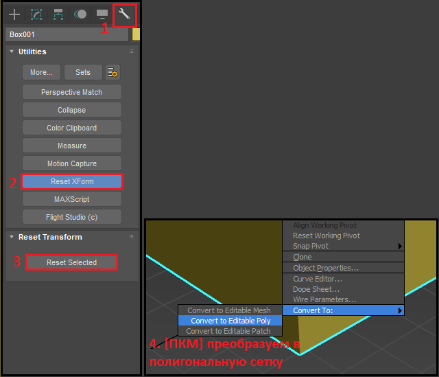- Сбрасываем трансформацию объектов (нужно выполнять для правильности отображения модели 1:1 - метров)